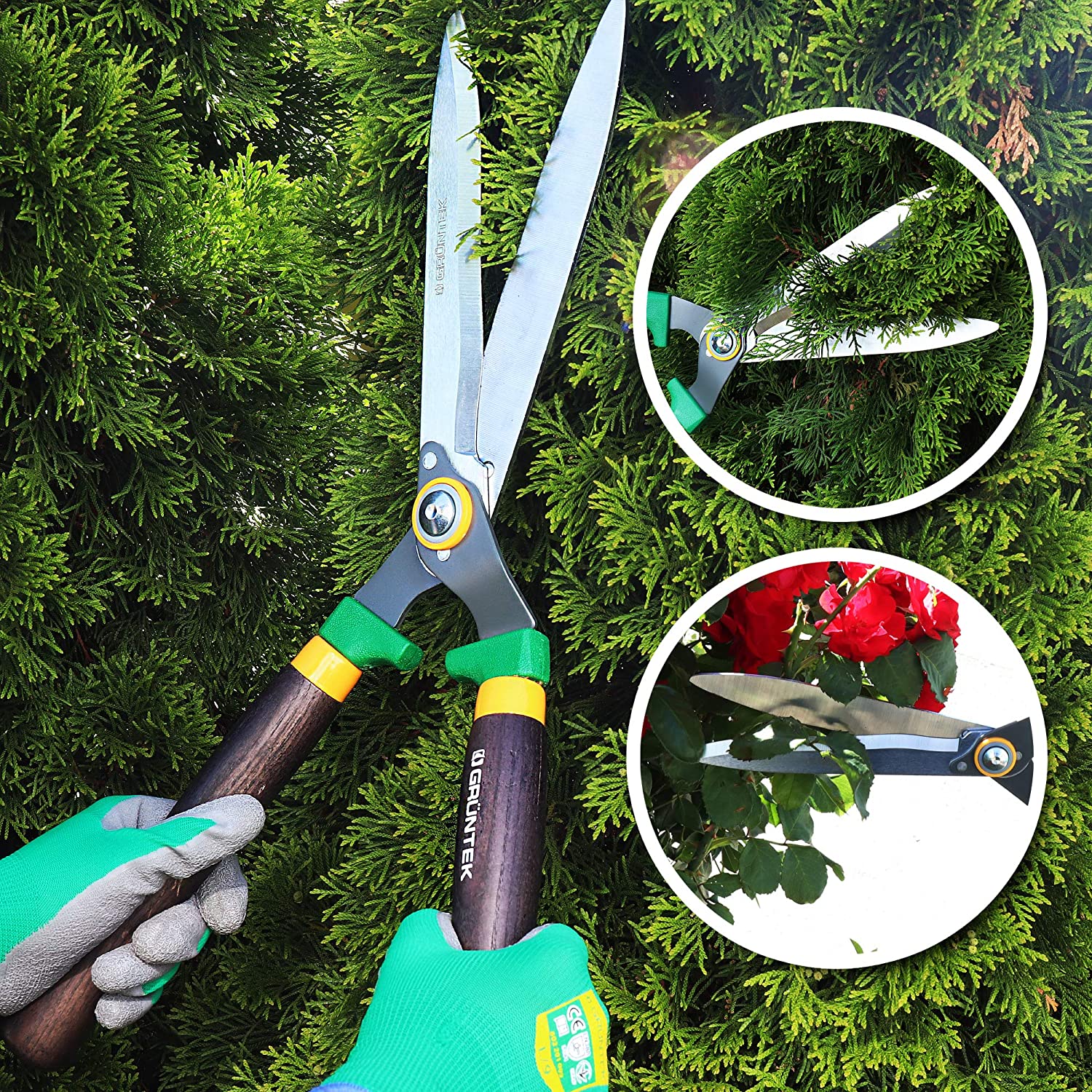 Premium класу. Рекомендовано для стрижки живої огорожі Леза хвилясті з загартованої високовуглецевої сталі SK5 Преміальні рукоятки з дерева (ясен) Довжина ножиць - 640мм
