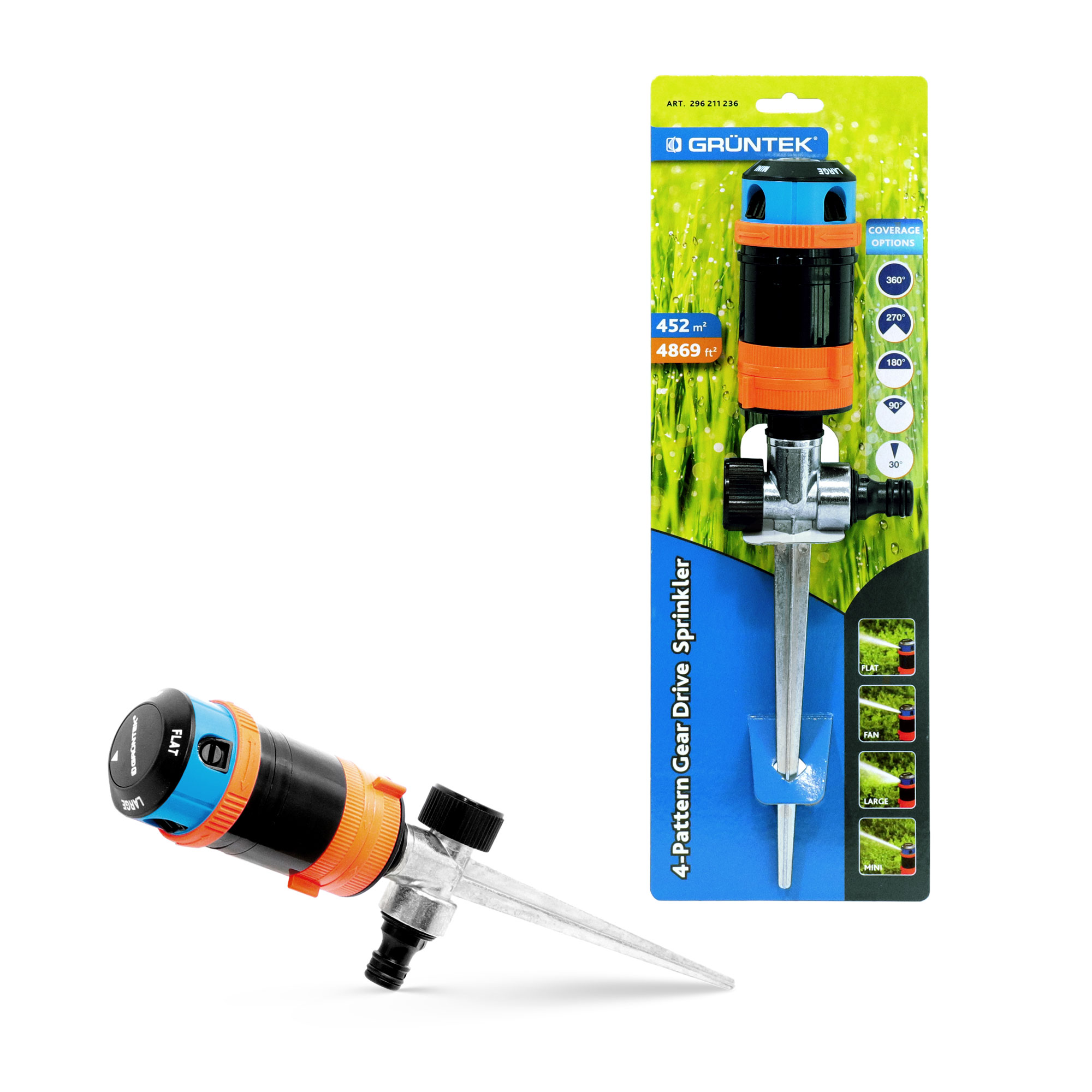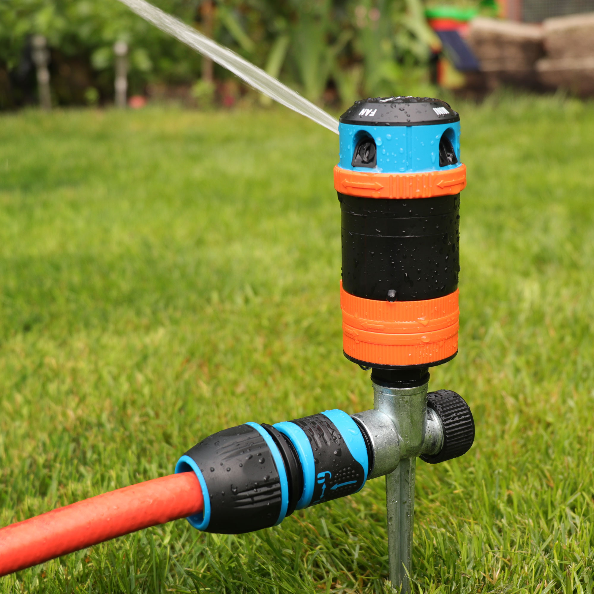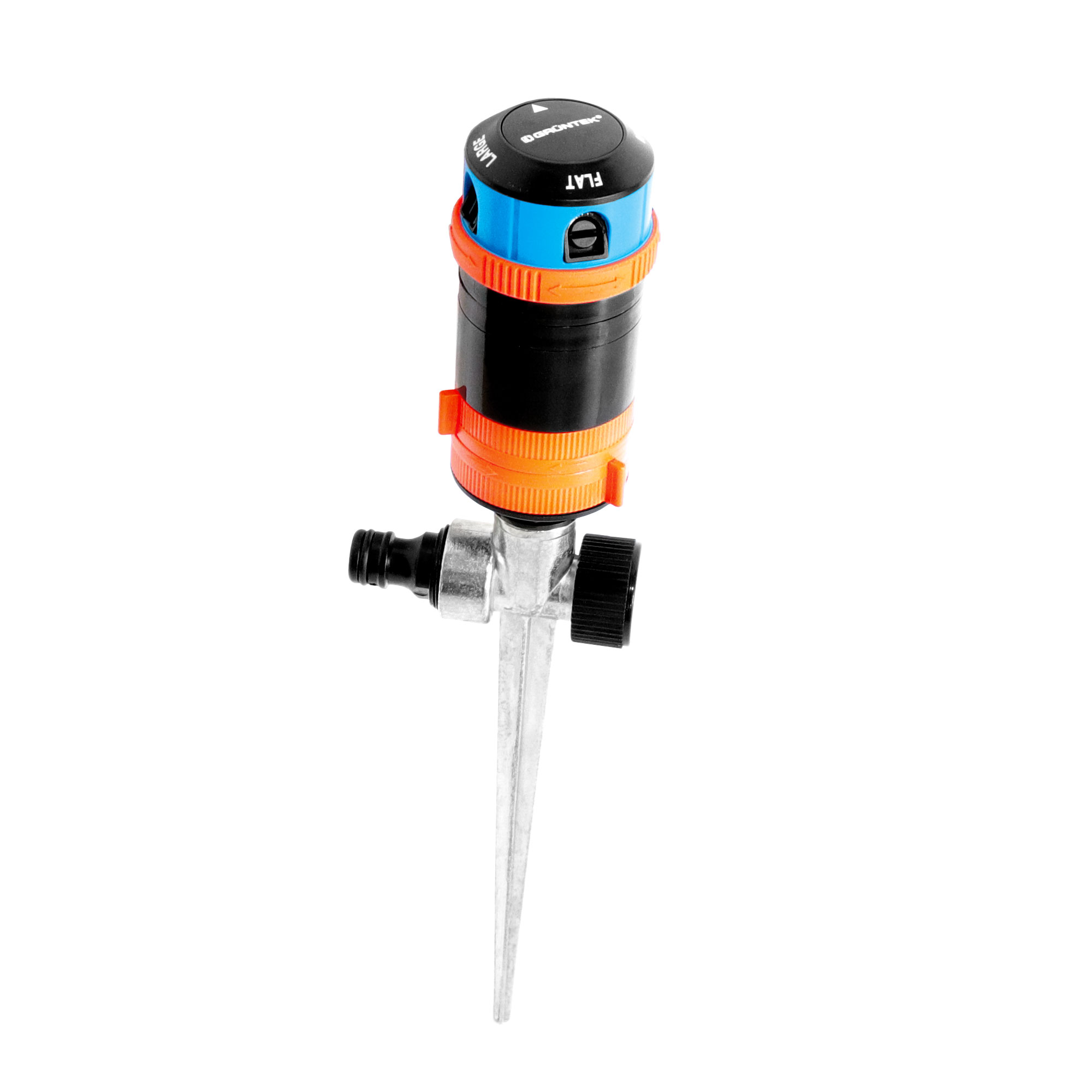 Рекомендовано для середніх секторних кутових газонів і садів площею 85- 452м², оптимальний тиск 4-8 бар. Полив по секторам: 30°, 90°, 180°, 270°, 360°, 4 типи струменя: сильний, слабкий, горизонтальний, вертикальний Підтримує з'єднання з іншими дощувачами. На металевому кілку