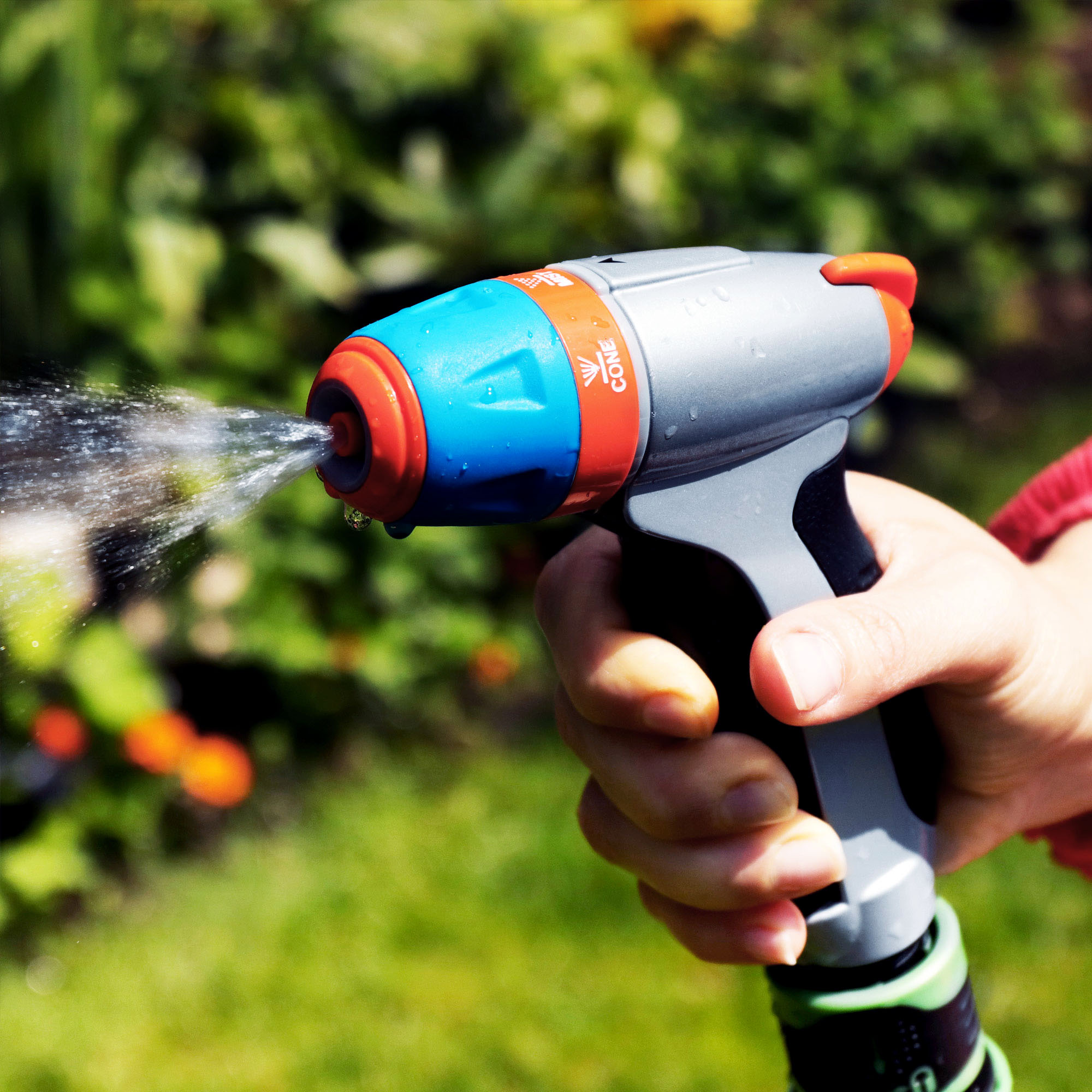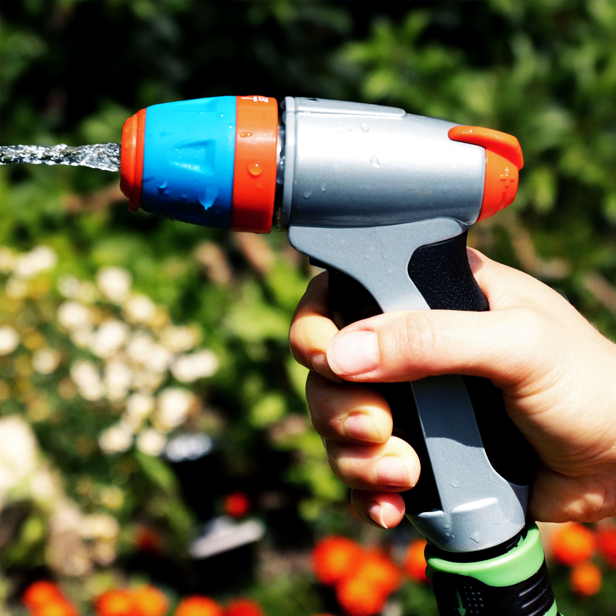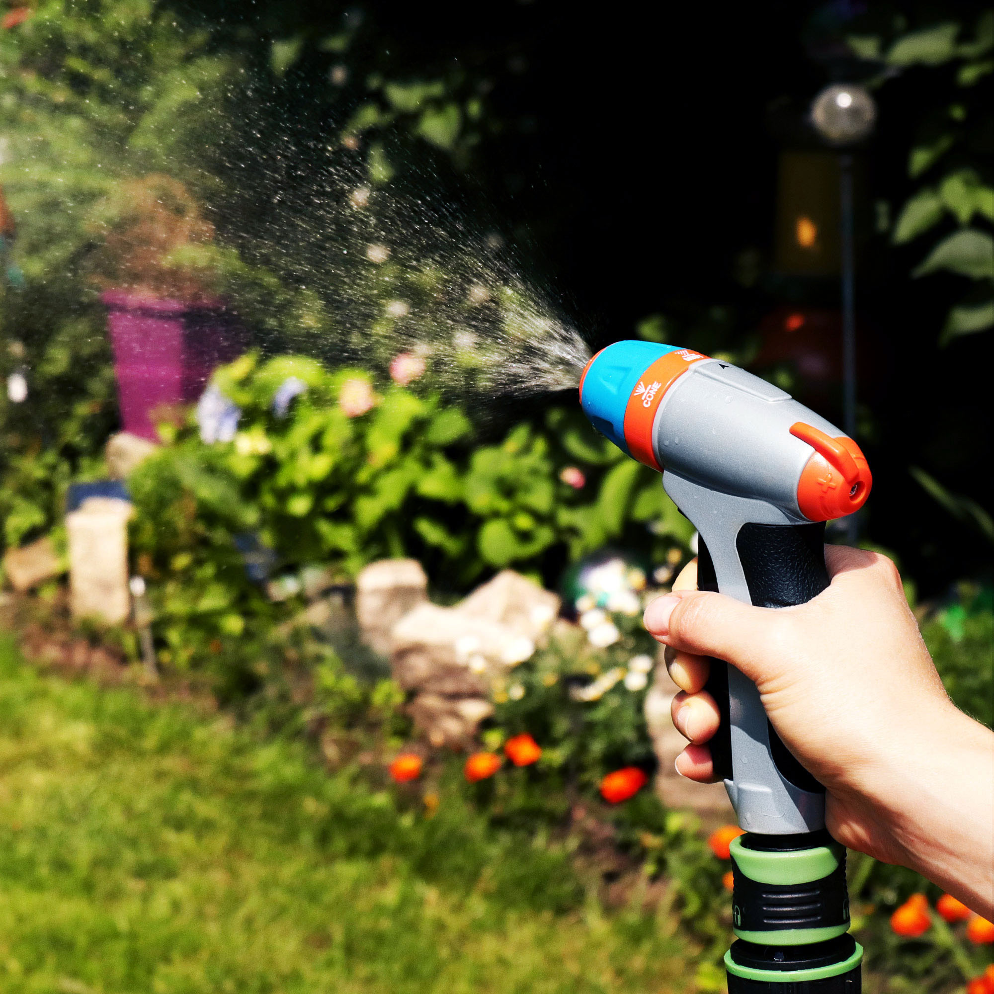 Рекомендовано для поливу рослин та газону, миття доріжок, садового інвентаря, автомашин 3 типи струменя (точковий, віяловий, туман) з регулюванням тиску води Металевий корпус з кнопкою фіксації включення Протиковзка ручка з гумовою накладкою