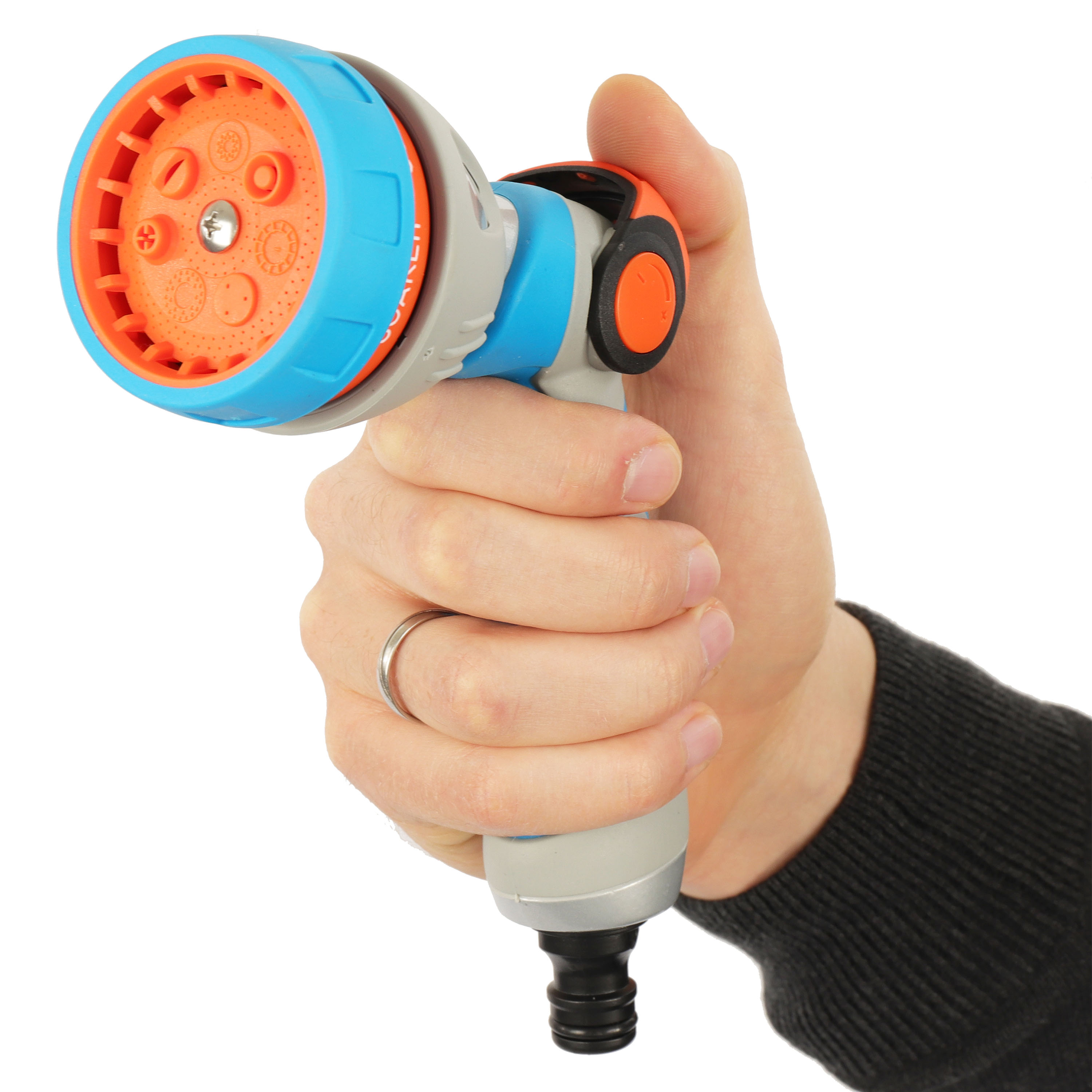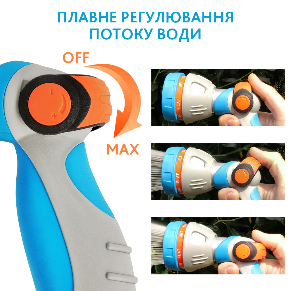Рекомендовано для поливу рослин та газону, миття доріжок, садового інвентаря, автомашин Типи струменю: точковий, душ, туман, плаский, конусний, дощувальний, турбо, кутовий, лійка Регулювання тиску води важелем на корпусі Металевий корпус з резиновою накладкою