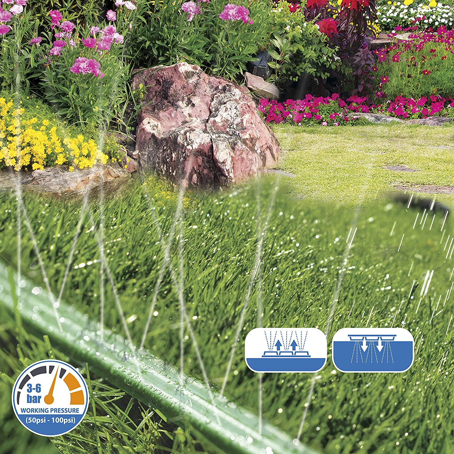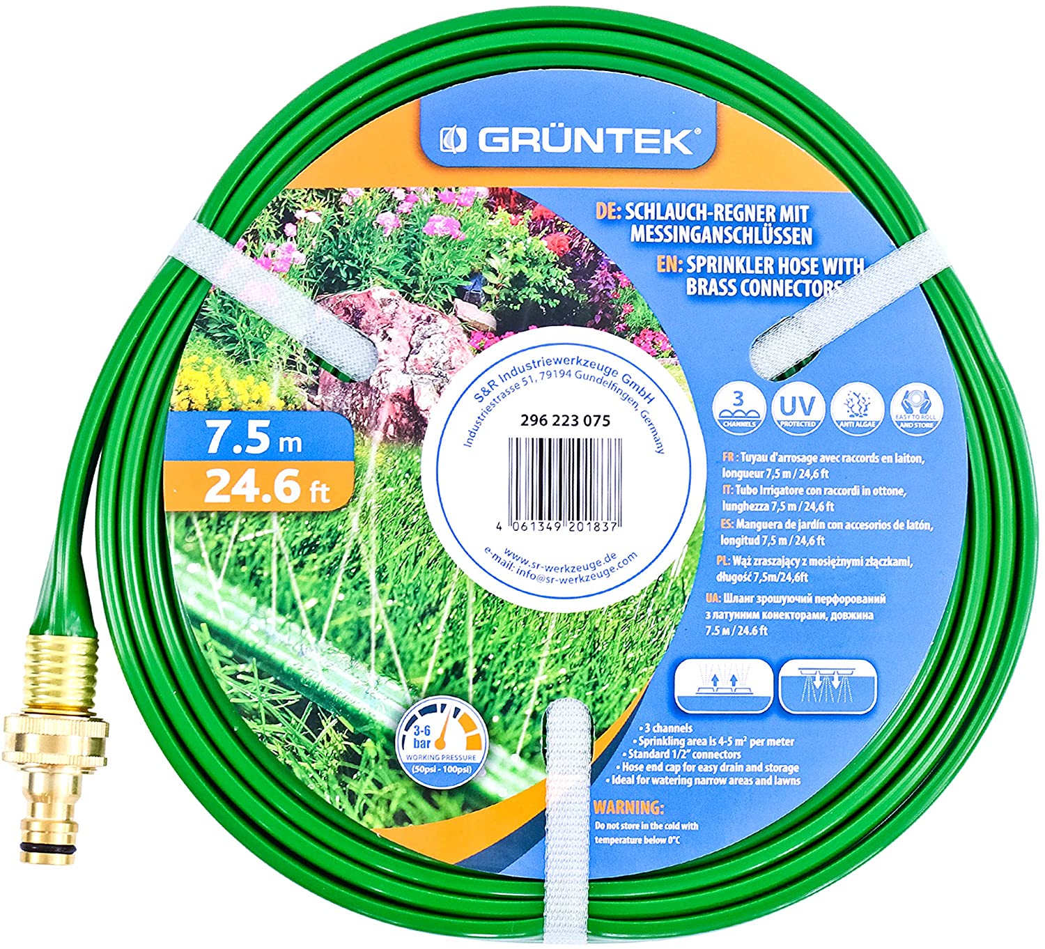 Рекомендовано для поливу ділянок площею до 4-5м² на один метр довжини шланга Триканальний плаский шланг Спеціально оброблений для запобігання плісняві Довжина шлангу - 7,5м, робочий тиск - 3-6 бар Латунні конектори