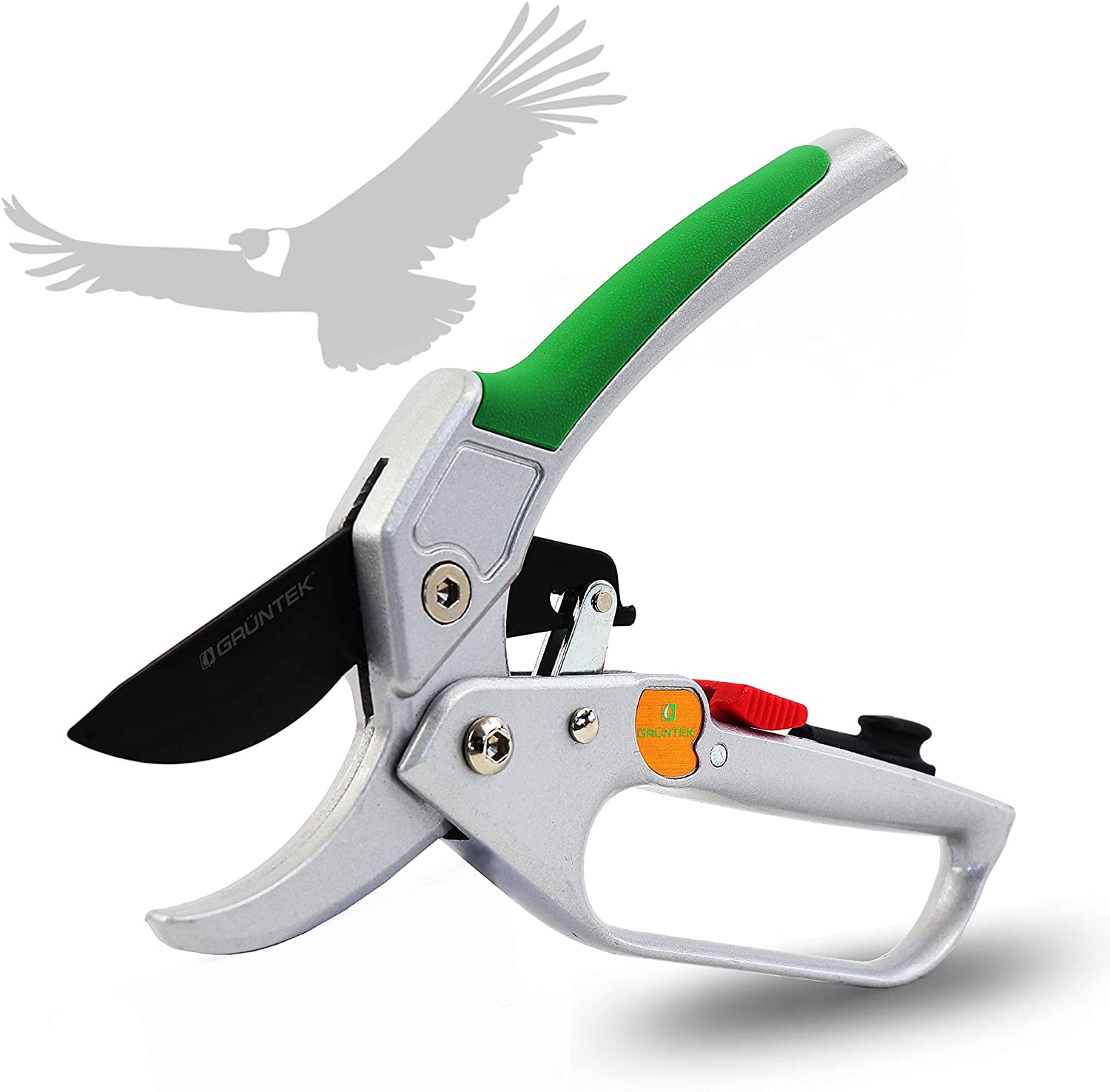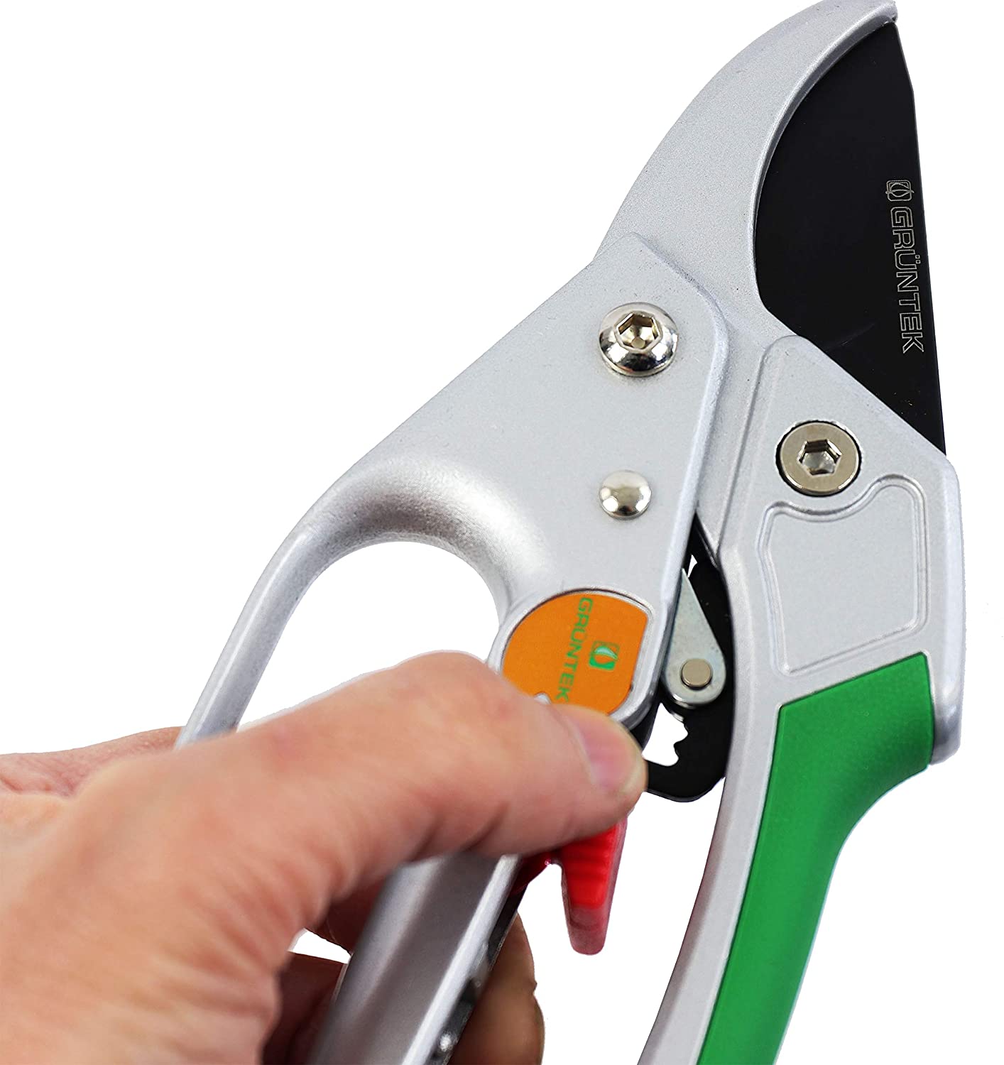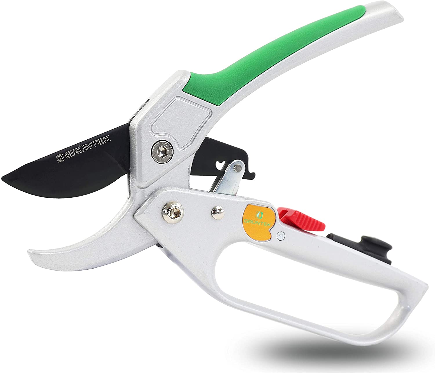 Рекомендовано для обрізки сухих гілок Полегшений, з наковаленкой та 4-режимним храповим механізмом, з автоматичним перемиканням режимів різу Лезо із загартованої високовуглецевої сталі SK5 Покриття NON-Stick на лезі проти налипання Алюмінієві рукоятки з м'якою накладкою Точило та масляна губка в комплекті Довжина секатора 200мм